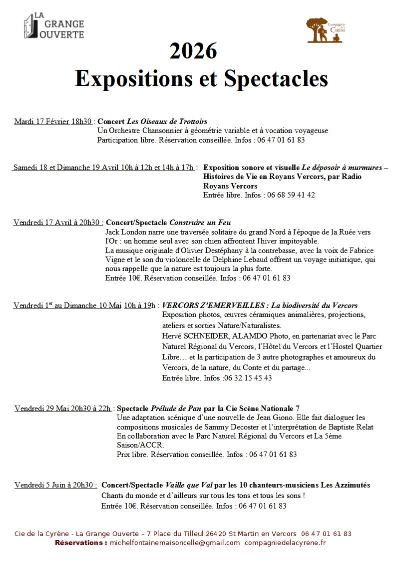 A la Grange Ouverte : Ci dessous la programmation 2026 :